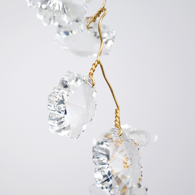 Made with clear crystal bars and golden plate, this product has 120 cm diameter and regulable high (the part with crystals is 260cm high).