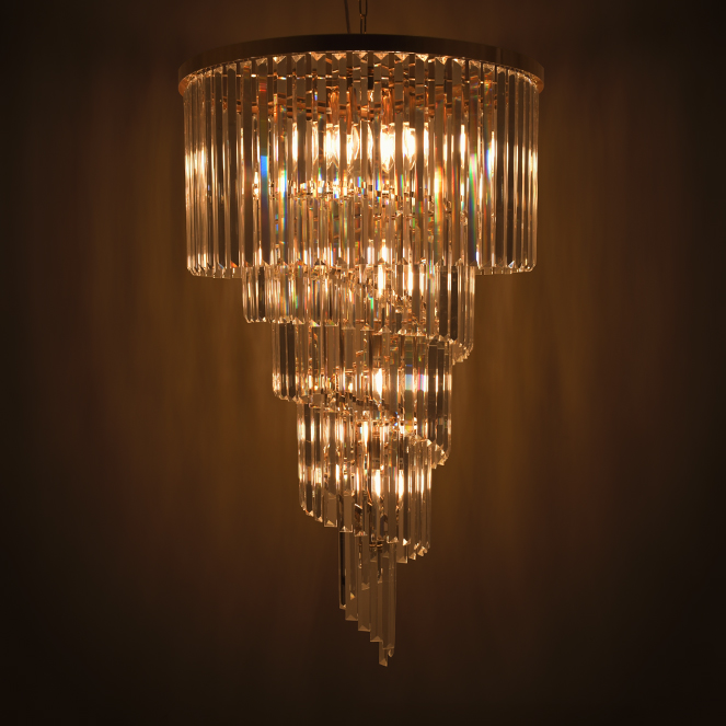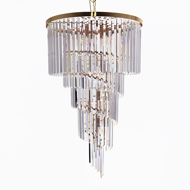 We present you the ceiling lamp OLFUS. Made with transparent crystal bars and golden plate, this product is 200(máx.) cm high and has 60cm diameter. This model requires 12 light bulbs E14 (not included).