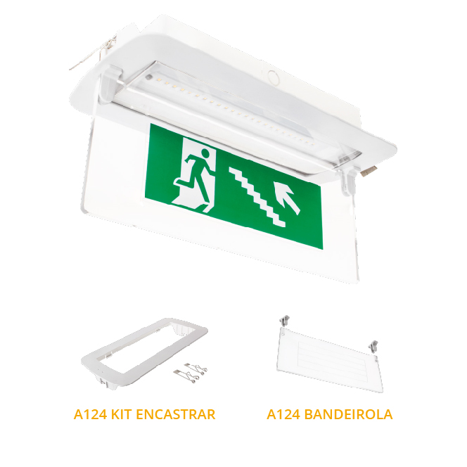 Within the Technical collection, we present to you the waterproof emergency light KALANI. The measures of this emergency light model are of 27 cm long, 10 cm wide, 5,4 cm high, in white (IP65). It offers a luminosity of 230 Lumens. This model contains 1 LED module of 4,8W 4000K. This emergency luminaire can work in maintained or non-maintained mode and has a remote control function. It may have a flag with signaling, when it is built-in (built-in frame sold separately). This emergency light has a test button on one side.