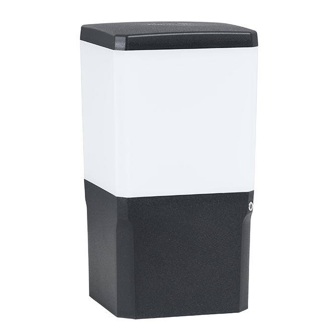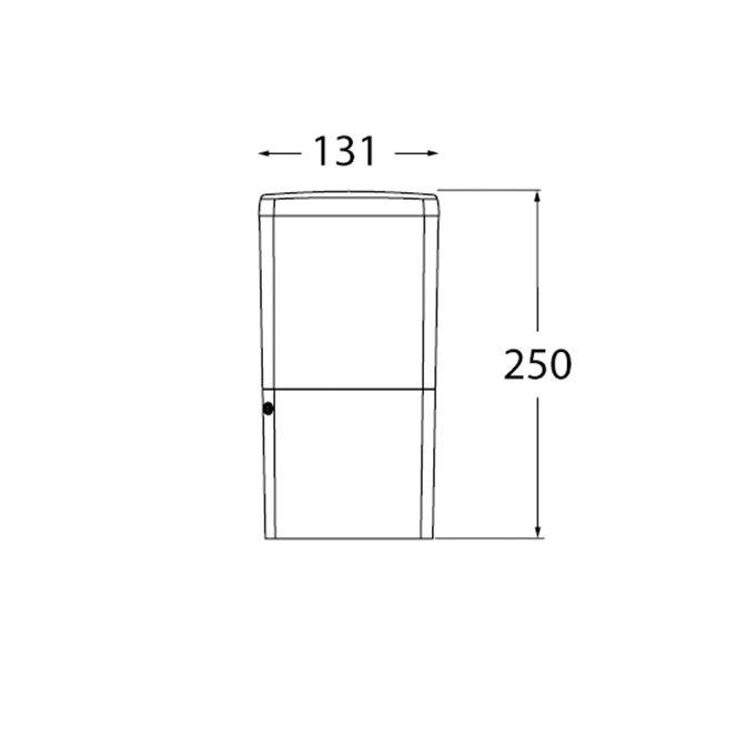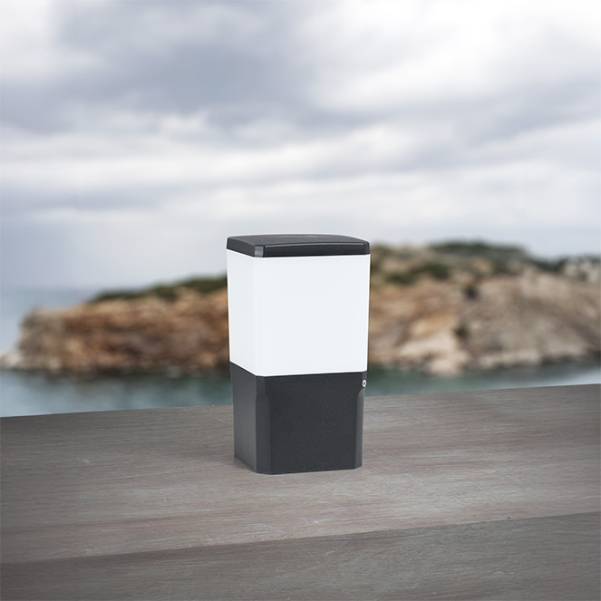 As medidas deste modelo de pilar são de 13,1 cm de comprimento, 13,1 cm de largura, 25 cm de altura, em resina preta e difusor opalino em PMMA (IP55).